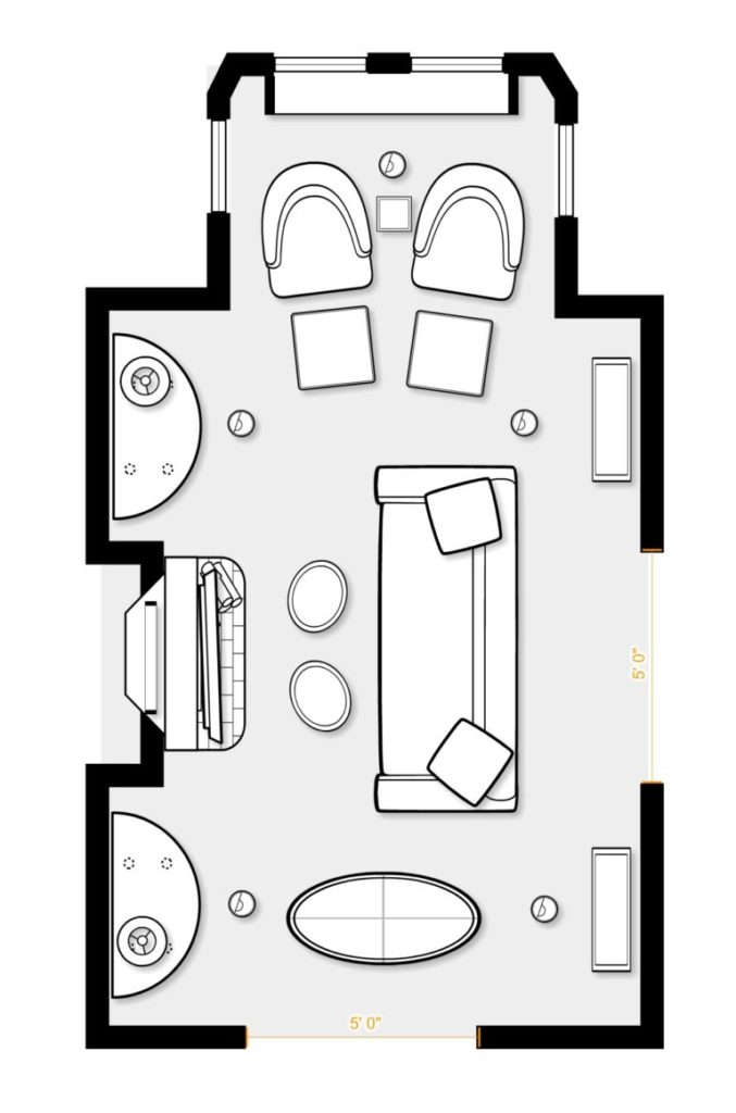 The living room’s dominant architectural feature is a nook with a wide bay window and a pair of side windows. Here’s a look at the space with our proposed furniture plan: