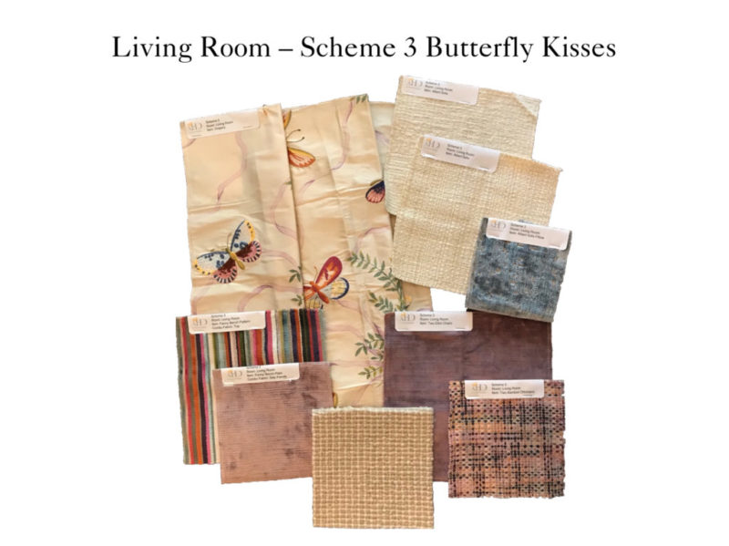 Armed with this feedback, we then developed three distinct schemes. Each proposed design began with an inspiration fabric (earmarked for the window treatments) that drove the other selections.