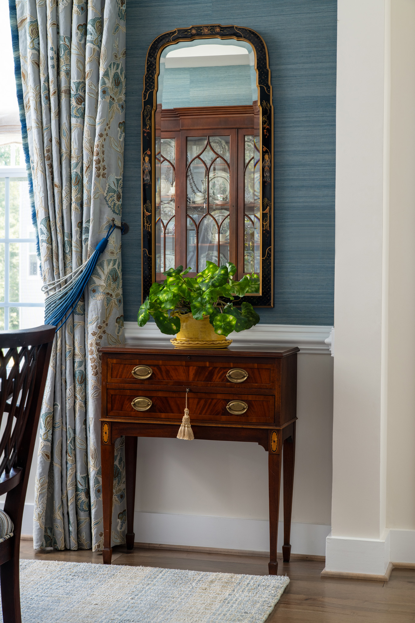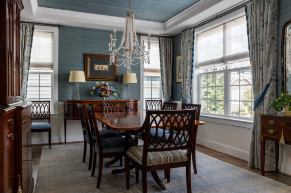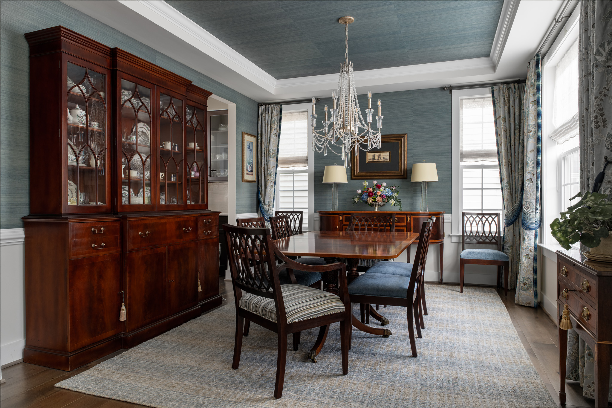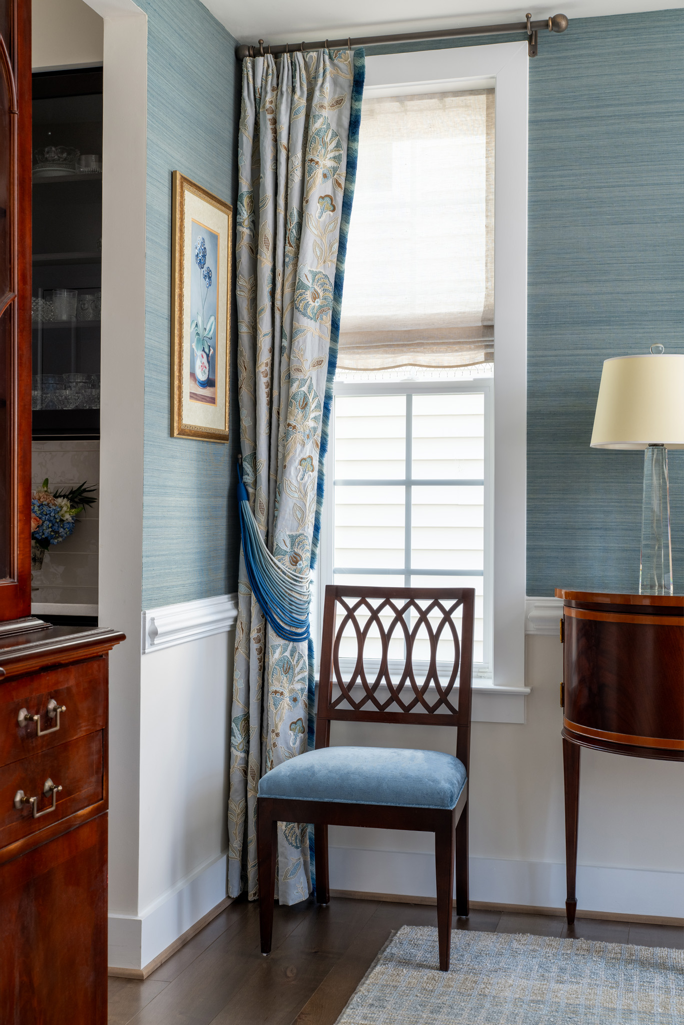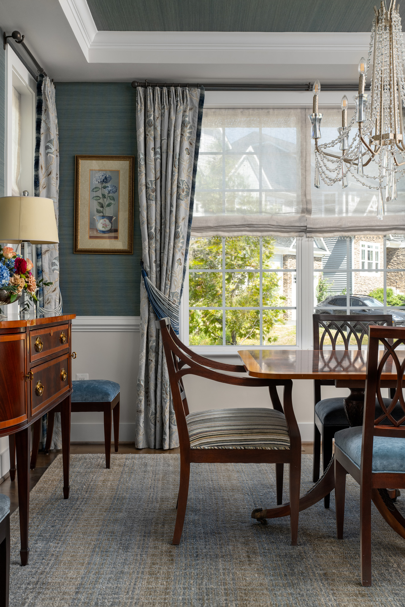 In the dining room, our challenge was to provide a fresh look, while repurposing the couple’s existing dark-wood furniture and crystal chandelier. We introduced new elements—from the blue grass cloth lining the walls and ceiling to the botanical-print embroidered linen used for the window panels—to balance those traditional, formal pieces.
